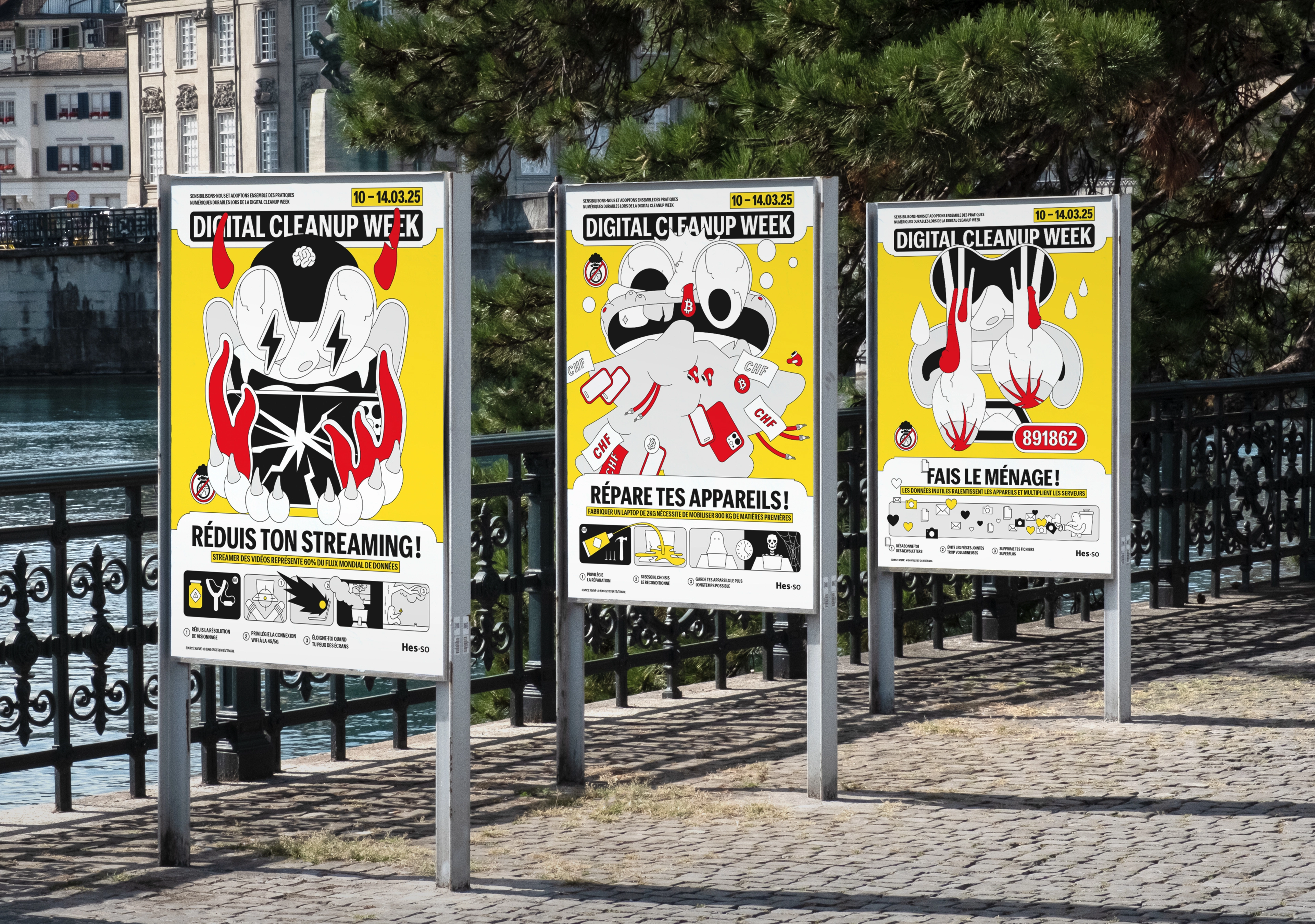 This project was selected as the winner of the HES-SO competition for the Digital Clean Up Week poster campaign. Created in collaboration with designer Alexandre Caruzzo, the project adopts a visual approach based on satire, subverting the graphic codes of instruction notices and user manuals. By imitating familiar references, the poster invites the public to question their daily digital habits and encourages them to adopt simple actions for a more responsible digital future. Humour and visual appropriation are used as levers to raise awareness of the issues of digital pollution and sustainability.