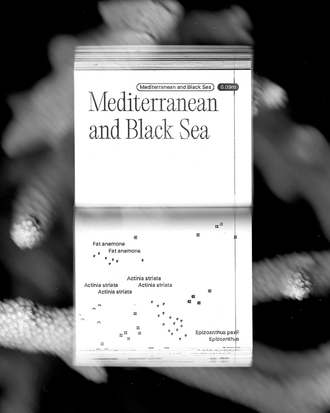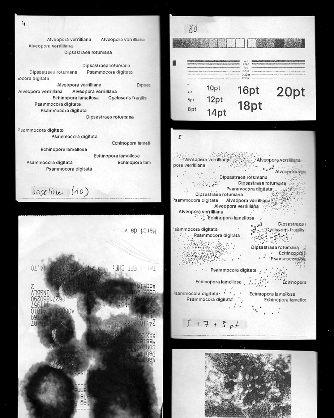 The use of thermal paper, a fragile and fading medium, reflects the vulnerability of coral ecosystems. This deliberate restriction transforms scientific information into a sensitive visual experience, where form replaces illustration.